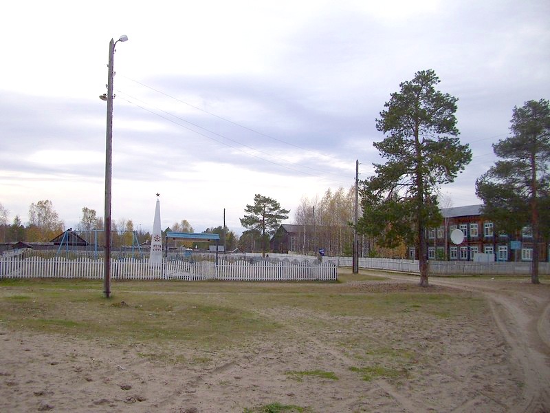 В центре посёлка Чепец. Памятник героям войны и школа.