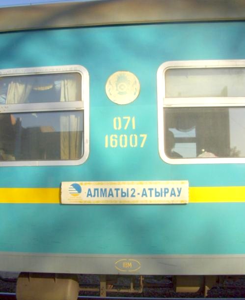 Через два часа после прибытия автобуса отправлялся скорый поезд «Акжайык» сообщением Гурьев — Алма-Ата-II. Но, как очень часто бывает в Казахстане, на него не было билетов. В кассе выясняю стоимость проезда в плацкартном вагоне до Алма-Аты — 2500 тенге. Уже у входа на вокзал пассажирам навязывали свои услуги проводники этого поезда, предлагавшие содействие в проезде.