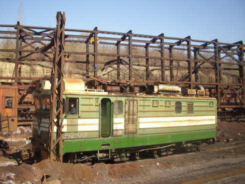 Электровоз ПЭУ2-001 в тупике, в котором производится погрузка руды.