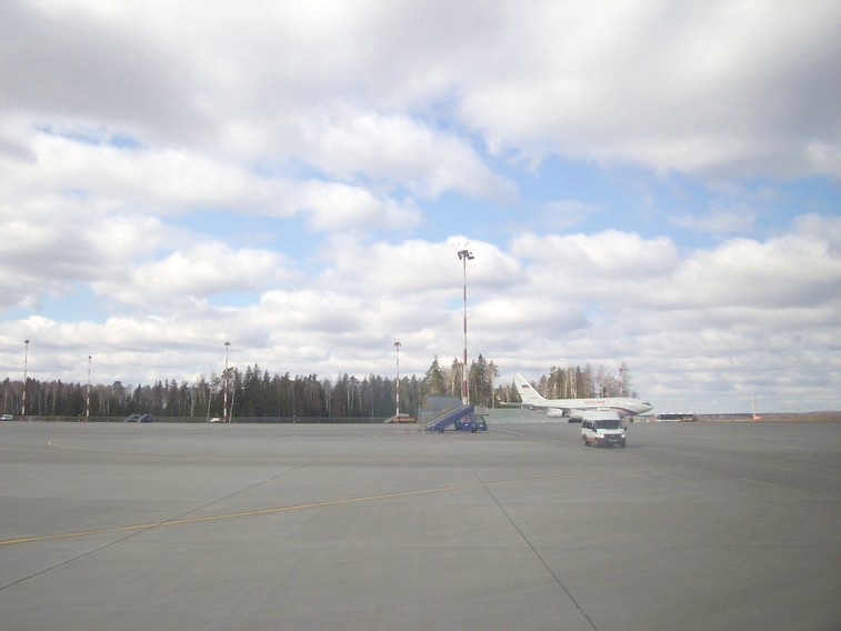 Аэропорт впечатляет гигантскими ангарами, предназначенными для обслуживания крупнейших в мире самолётов Ан-124 «Руслан». Пассажиров везли двумя перронными автобусами, один из которых являлся «раритетным» ЛиАЗ-677.
