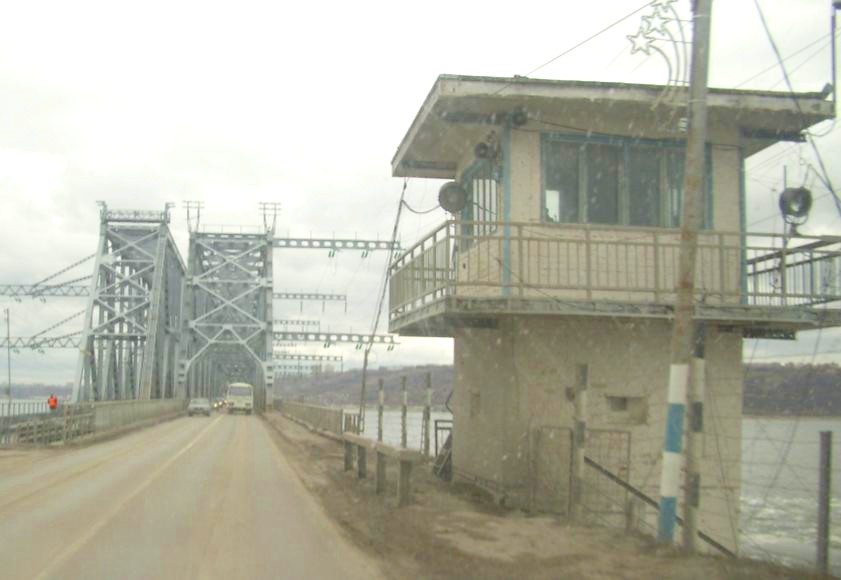 У въезда на мост с левого берега. Дежурящие на этом посту охранники преграждают доступ