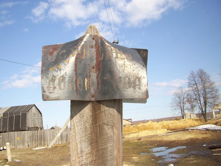 Сохранившийся знак «остановка локомотива» на бывшей пассажирской станции в Октябрьском.