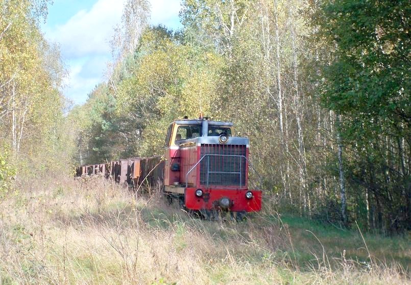 Быстрым шагом иду по узкоколейной железной дороге, выполняя фотодокументирование. В этой точке http://old.wikimapia.org/#lat=51.8887094&lon=26.6244857&z=16&l=1&m=b&v=8 встречаю тепловоз с гружёным составом, следующий на завод. Доезжаю до завода.