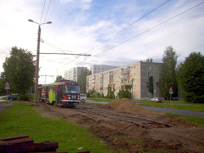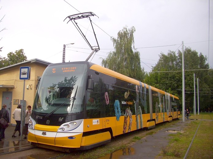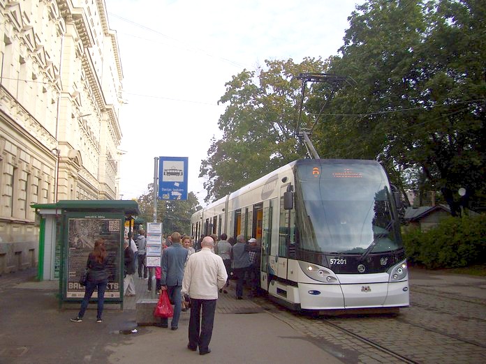 Новый трамвайный вагон в Риге. Остановка «Stacja Laukums».