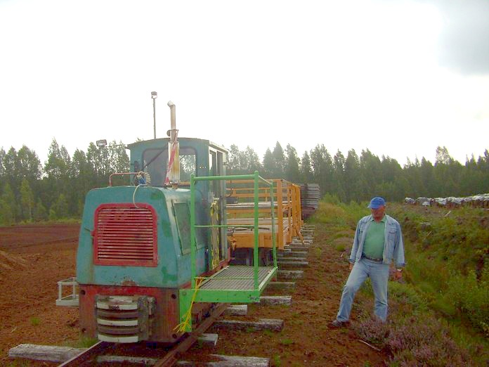 Здесь есть пассажирские перевозки — малый мотовоз водит платформу с деревянными скамьями. На ней рабочие доставляются в дальнюю точку торфомассива.