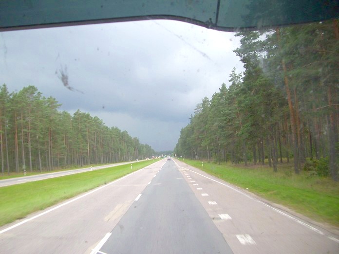 Автодорога Псков — Рига вблизи Риги. Вид из кабины торфовозной машины.