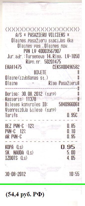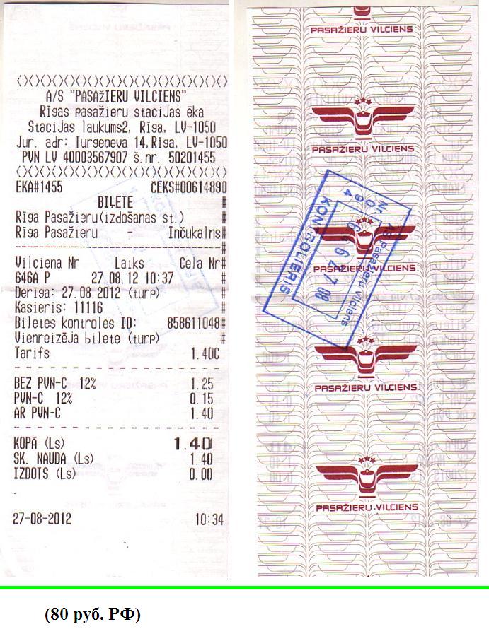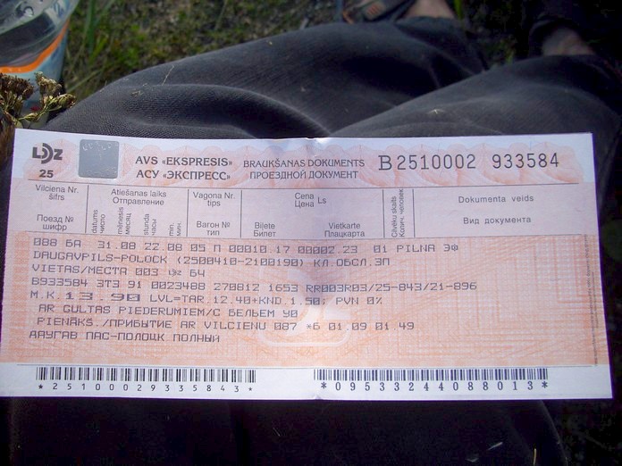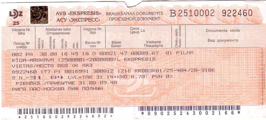 То, что удалось взять билет в общий вагон поезда Рига — Москва в один из самых «сложных» дней года, можно считать удачей. Конец августа — пиковое время для пассажирских перевозок, часто нет никаких мест. Билет стоил 31,84 LVL (1823 рубля, расстояние 922 км). Это минимально возможная цена для данного маршрута. Не будь билетов на поезд — пришлось бы срочно брать билет на самолёт, что могло бы стоить и 10 тысяч рублей.