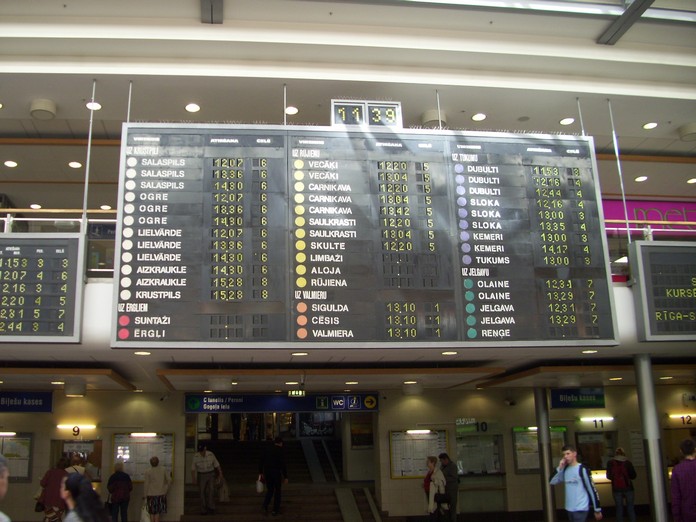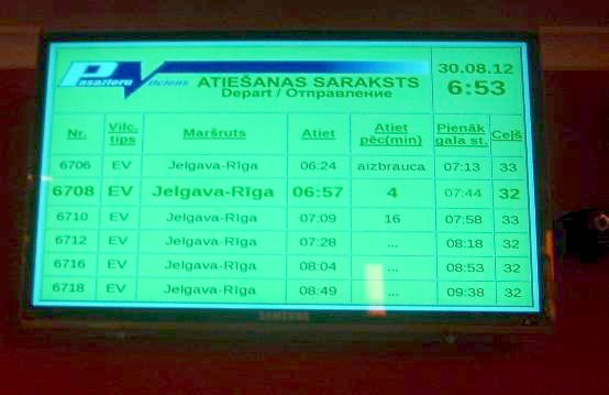 Вокзал на станции Елгава. Табло с отображением ближайших отправляющихся поездов.