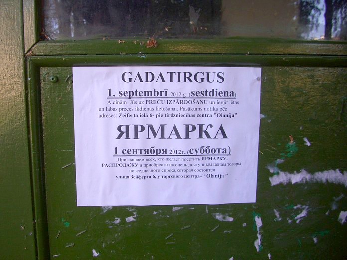 Олайне. Типичное для Латвии неофициальное двуязычное объявление.
