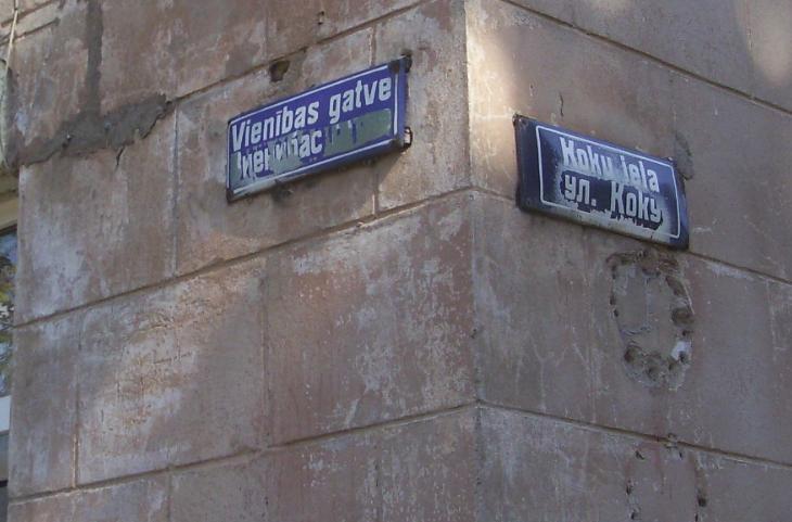 Рига. Советские таблички с названиями улиц, где текст на русском языке замазывали.