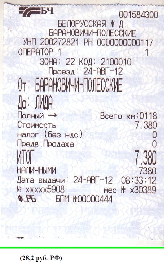 Билет Барановичи-Полесские — Лида.