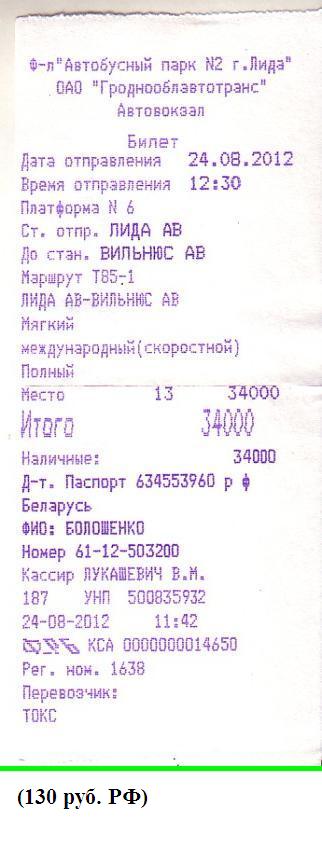Я был готов к тому, что межгосударственный автобус будет стоить дорого, как минимум 10 евро в эквиваленте. И был потрясён, когда в справочной автовокзала назвали цену: «тридцать четыре тысячи» (составляет 130 RUR, 3 евро). Это почти вдвое дешевле автобусного тарифа внутри Беларуси и втрое дешевле автобусного тарифа внутри Литвы! Стандартная ситуация является обратной: межгосударственный транспорт дороже внутреннего.