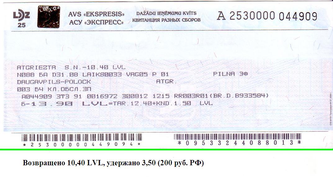 На капитально ремонтируемом участке трамвайной линии пущен замещающий автобусный маршрут. Доезжаю автобусом до действующей трамвайной станции «45 Vidusskola». Современным «метроподобным» трамваем — до железнодорожного вокзала, где приобретаю по карточке билет Двинск — Полоцк за 13,90 лат (796 рублей, расстояние по маршруту — 161 км). Позднее билет пришлось возвращать с потерей.