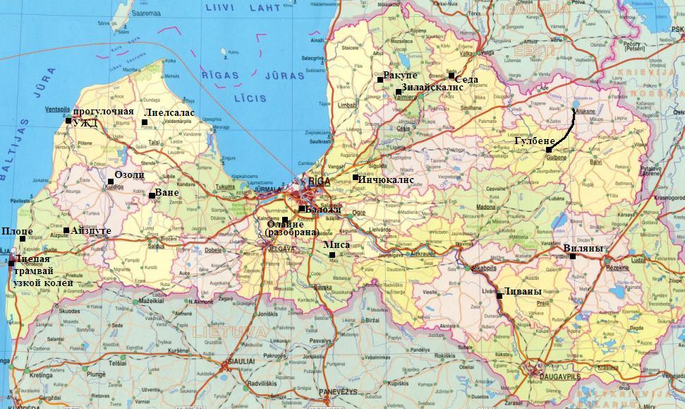 Расположение действующих узкоколейных железных дорог Латвии (на 2012 год).