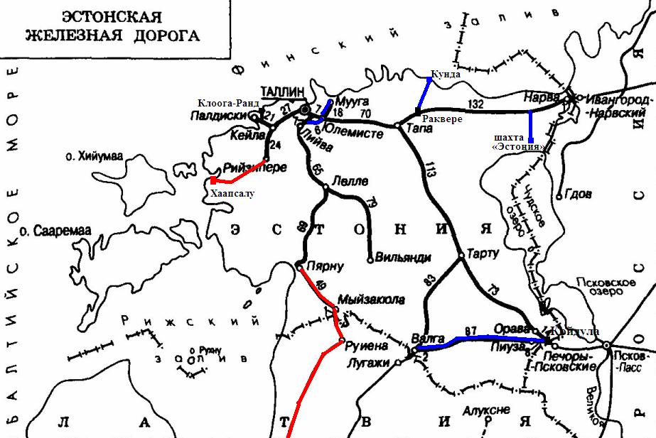 Схема железных дорог Эстонии, по состоянию на 2012 год. Обозначения — аналогичные.