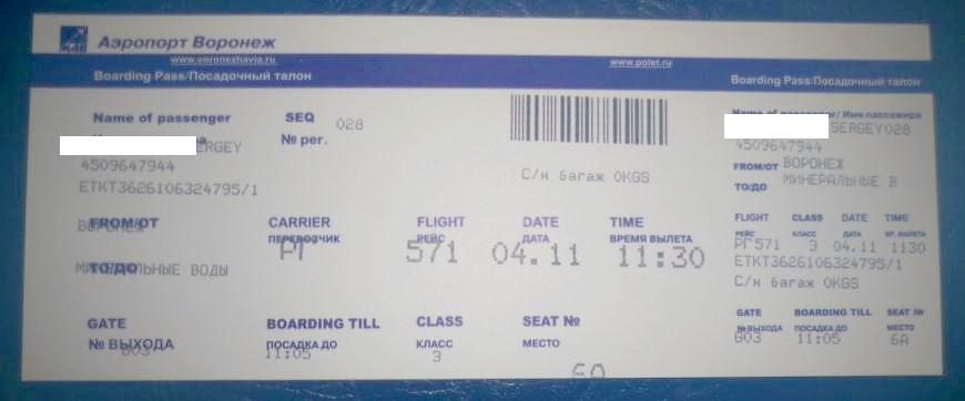 Посадочный талон Воронеж — Минеральные Воды.