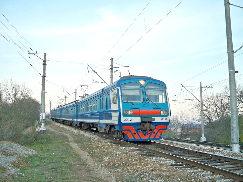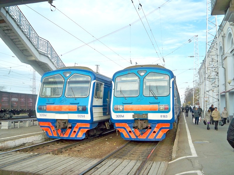 и электропоезд ЭД9М-0094 маршрута Кавказская — Минеральные Воды.