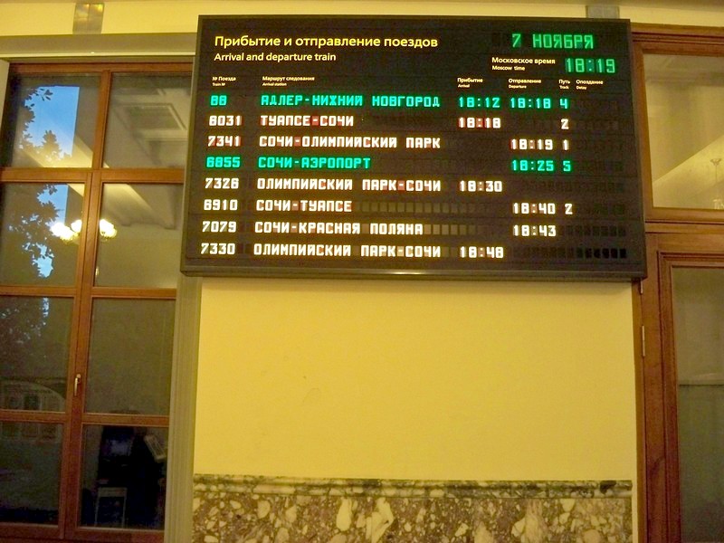 Станция Сочи. Информационное табло на вокзале. Сходный объём движения есть только в Москве.