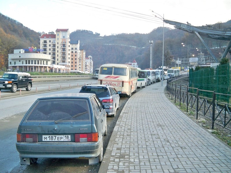 До открытия Олимпиады осталось три месяца, но здесь продолжается активное строительство. Множество рабочих из разных регионов России и машин с иногородними номерами.