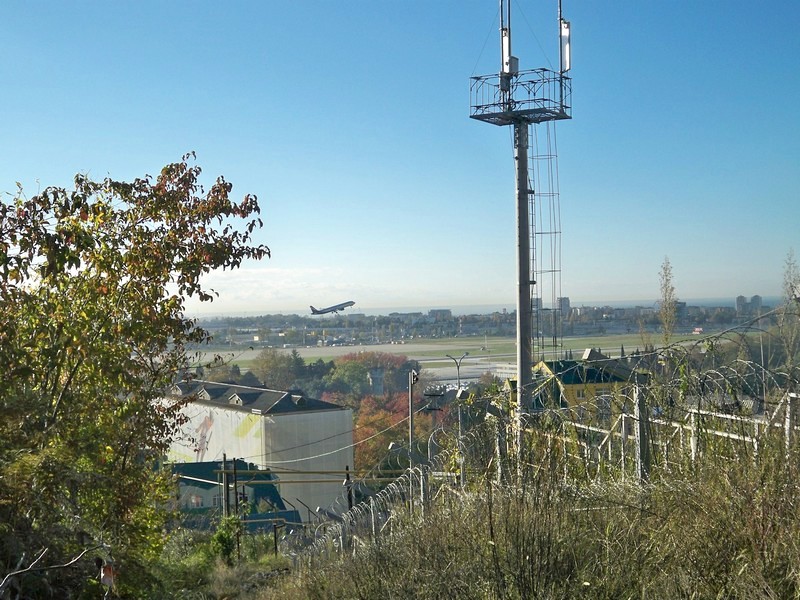 От станции Аэропорт Сочи иду пешком. Поднимаюсь по улицам «частного сектора» с армянским населением в единственную точку, где железнодорожную линию на Аэропорт Сочи можно увидеть хотя бы издали. Фотографирую линию через забор.