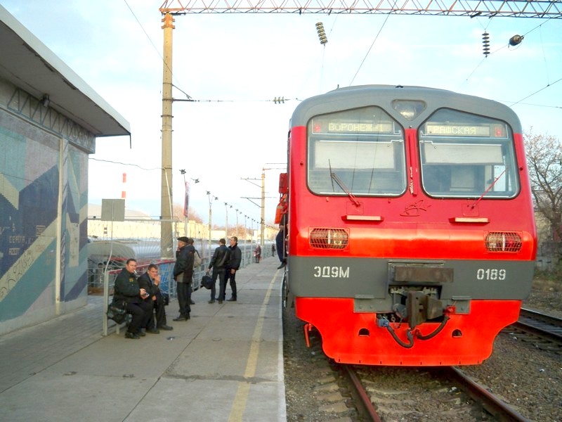 Вечерний электропоезд ЭД9М-0143 следует от Воронежа до станции Грязи как пассажирский. После Грязей с недавнего времени он превращается в «засыл» до Мичуринска.