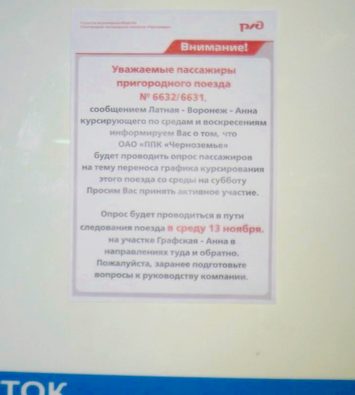 Объявление на вокзале Воронеж I, касающееся движения дизель-поезда до Анны.