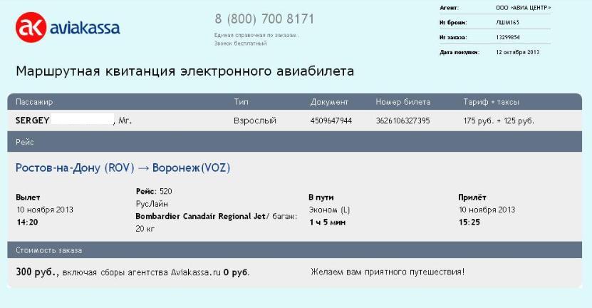 Электронный авиабилет Ростов — Воронеж.