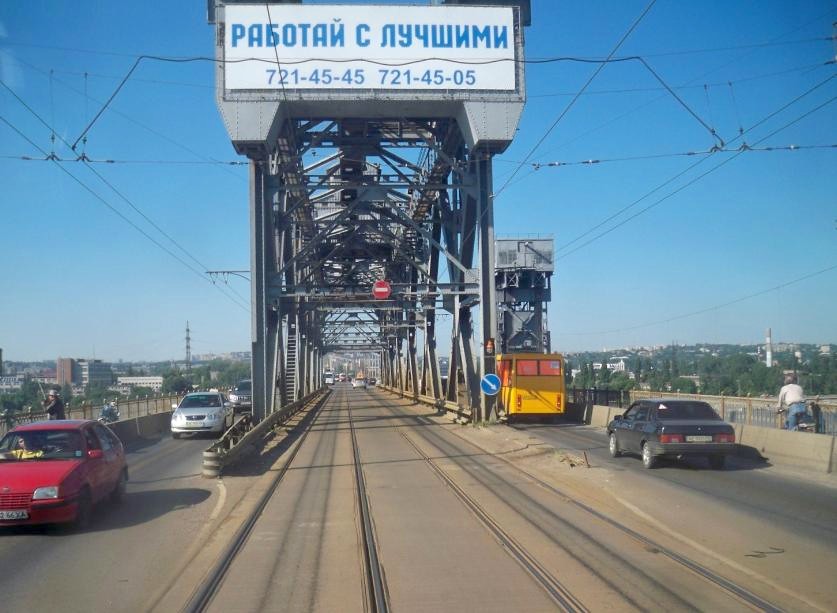Верхний уровень Амурского моста. Вид из трамвайного вагона на запад, в сторону центра города.
