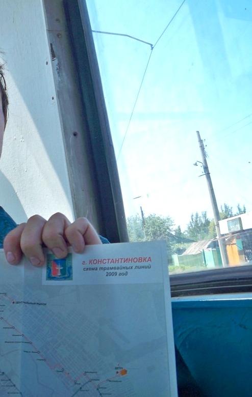 Константиновка. Поездка в трамвайном вагоне от "Сантуриновки" до "Молокозавода". Распечатанные схемы