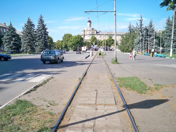 Возвращаюсь на вокзал. Затем иду в сторону центра города. Вот и первая трамвайная линия. Начинается изучение Мариупольского трамвая — одной из последних ещё не обследованных мной трамвайных сетей Украины.