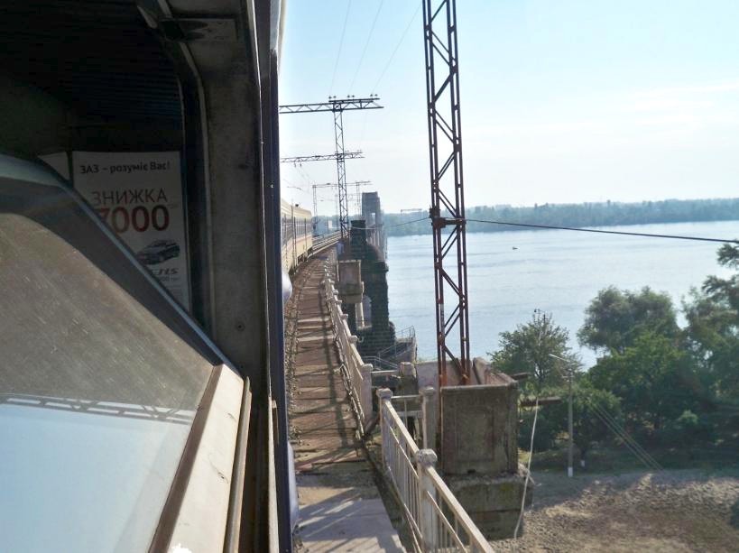 Электропоезд вступает на мост через реку Днепр.
