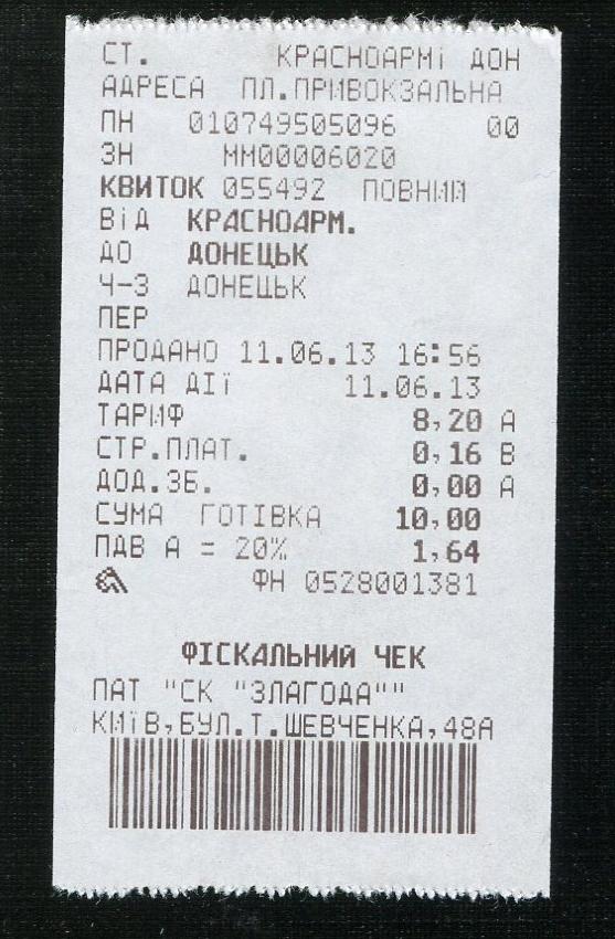 Билет Красноармейск — Донецк.