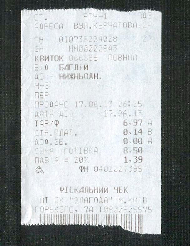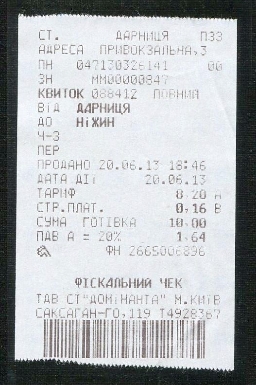 Билет Дарница — Нежин.