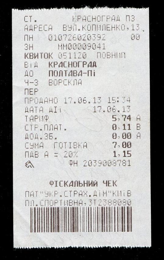 Билет Красноград — Полтава-Южная.