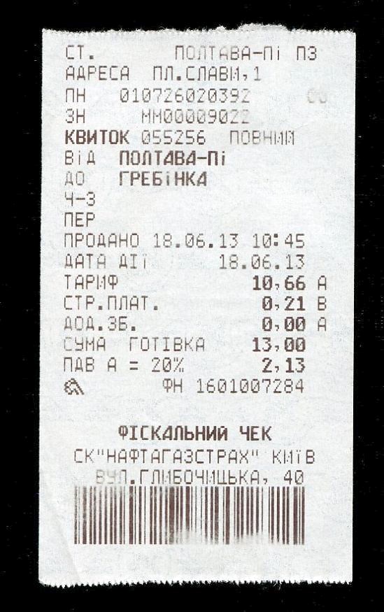 Билет Полтава-Южная — Гребёнка.