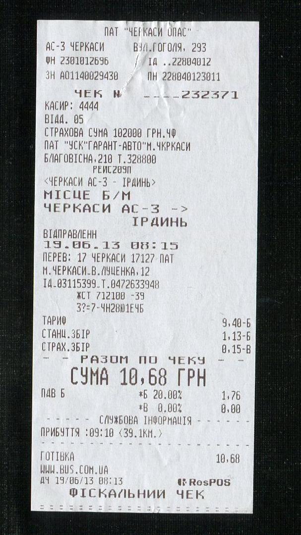 Автобусный билет Черкассы — Ирдынь.