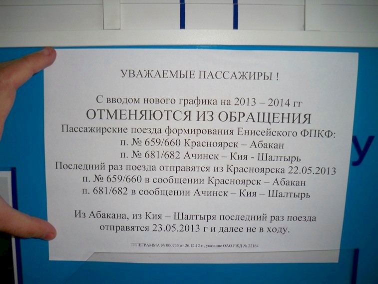 Объявление на станции Кия-Шалтырь.