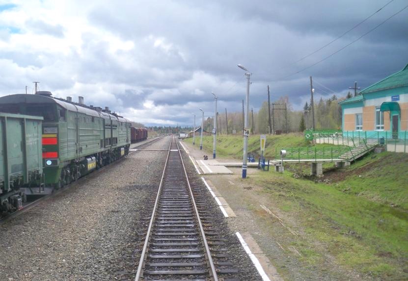 Электропоезд вступил на территорию гигантской промзоны и огромной электрифицированной станции. Никакой тайги нет — местность вблизи завода скорее является степью. Колючая проволока, памятный знак 35-летию железнодорожного цеха. Похоже, станция является ведомственной, не входит в состав сети общего пользования.