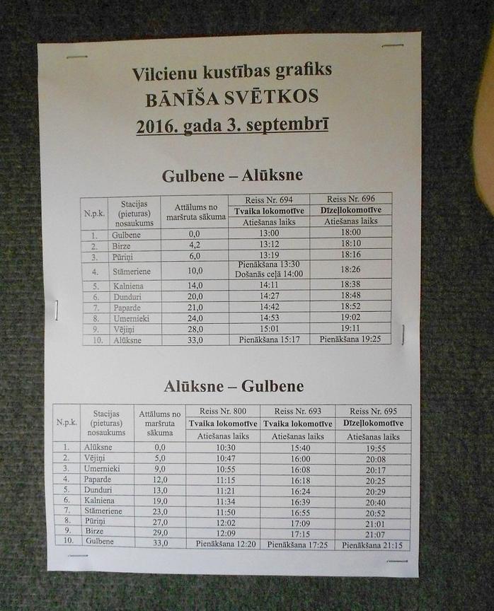 Поезд ориентирован на подвоз жителей Риги к праздничным мероприятиям на узкоколейной железной дороге Гулбене - Алуксне. Билеты и тариф - такие же, как в остальных пригородных поездах Латвии. Точнее говоря, на Латвийской железной дороге есть один (?) ускоренный дизель-поезд Рига - Даугавпилс с минимумом остановок и более высоким тарифом. Он имеет 700-ю нумерацию, а остальные - 6000-ю или 800-ю.