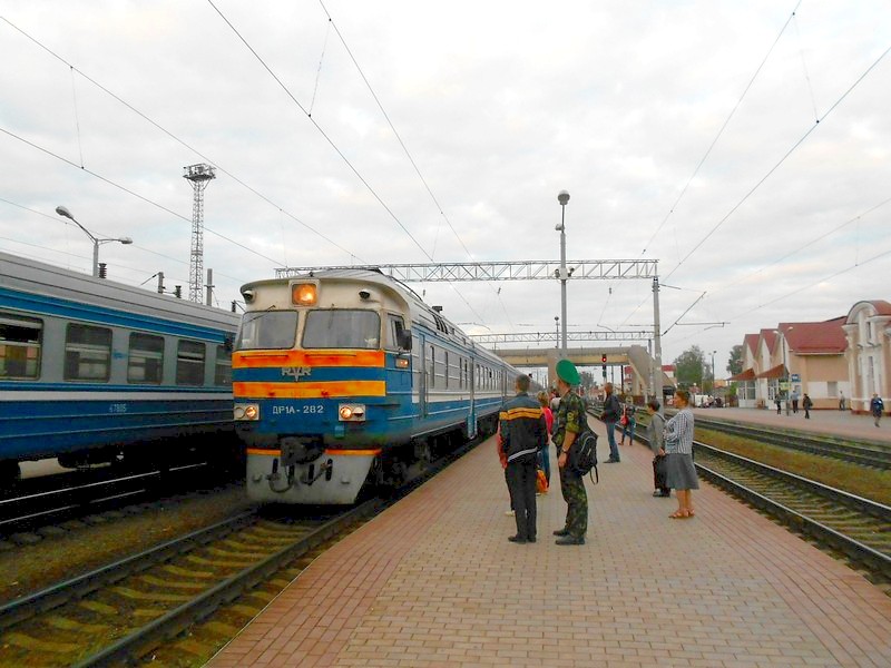 Прибывает дизель-поезд ДР1А-282 сообщением Минск - Гудогай. Именно так, не Молодечно - Гудогай. Почему-то не учёл это заранее.