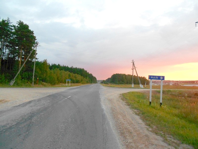 Выезд из Островца в 6:30. В 7:30 развилка в селе Ворона. За час преодолено 18 километров. Но дальше - встречный западный ветер, скорость падает.