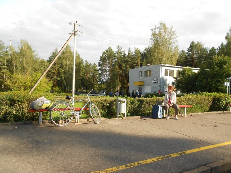 15:12, типовой послевоенный вокзал станции Плявиняс. Велосипед стоит, целый и нетронутый. Уже сутки и шесть часов, как он тут «скучает».