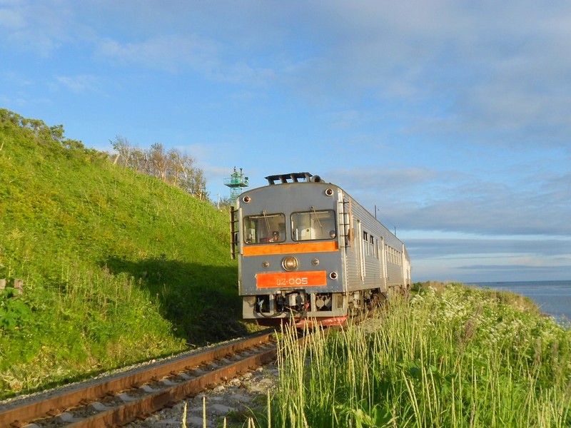Дизель-поезд Д2-005 сообщением Корсаков-Пять Углов - Южно-Сахалинск следует вдоль берега залива.