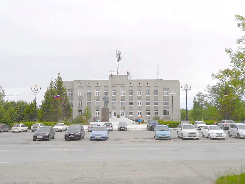Центральная площадь Анивы и здание администрации Анивского района. Время 11:53.