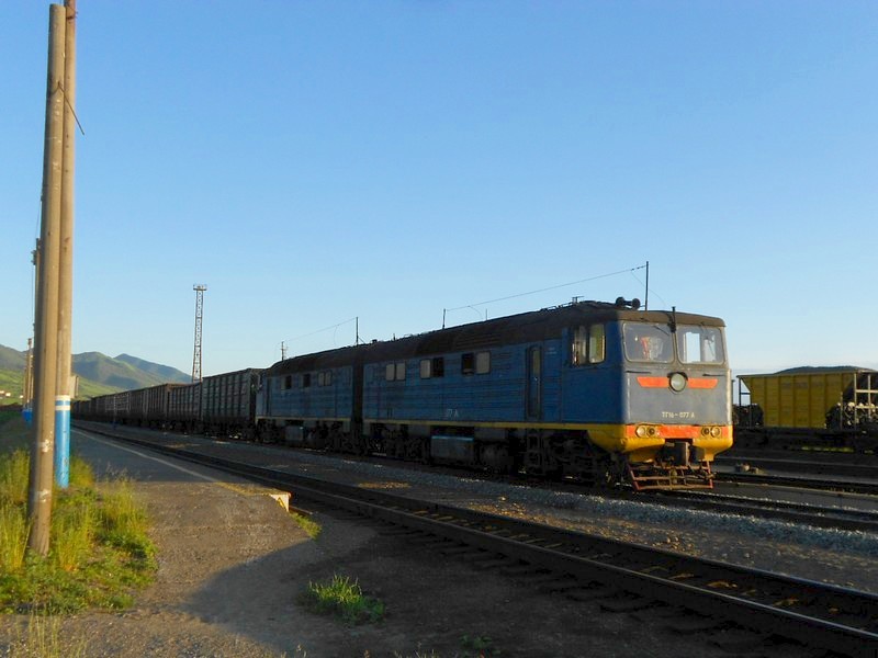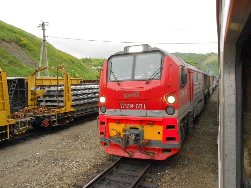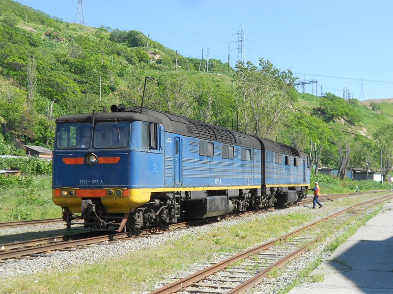 Тепловоз ТГ16-077 в ходе манёвров на станции Невельск. Время 16:36.