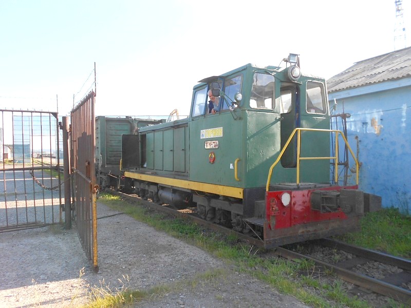 Ведомственный тепловоз ТУ7А на подъездных путях порта в Невельске. Время 18:39.
