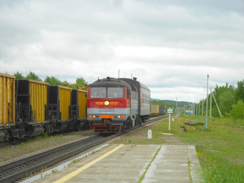 Станция Чехов. Тепловоз ТГ16М-001 ведёт грузовой поезд в сторону Ильинска. Время 6:49.