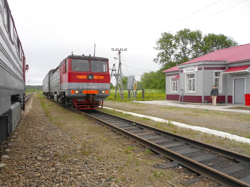 Пригородные поезда Южно-Сахалинск - Поронайск и Поронайск - Южно-Сахалинск встречаются на станции Пугачёво.