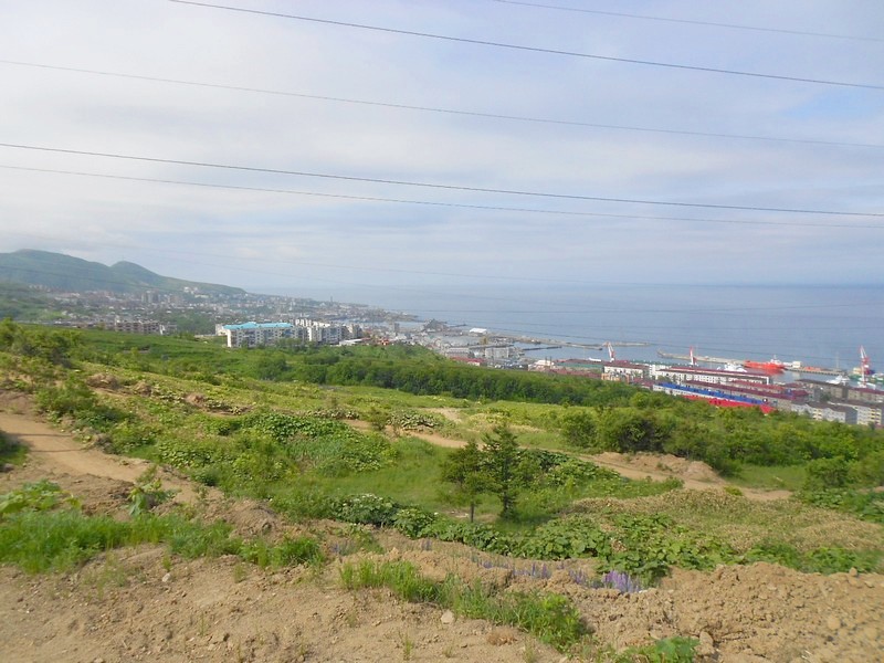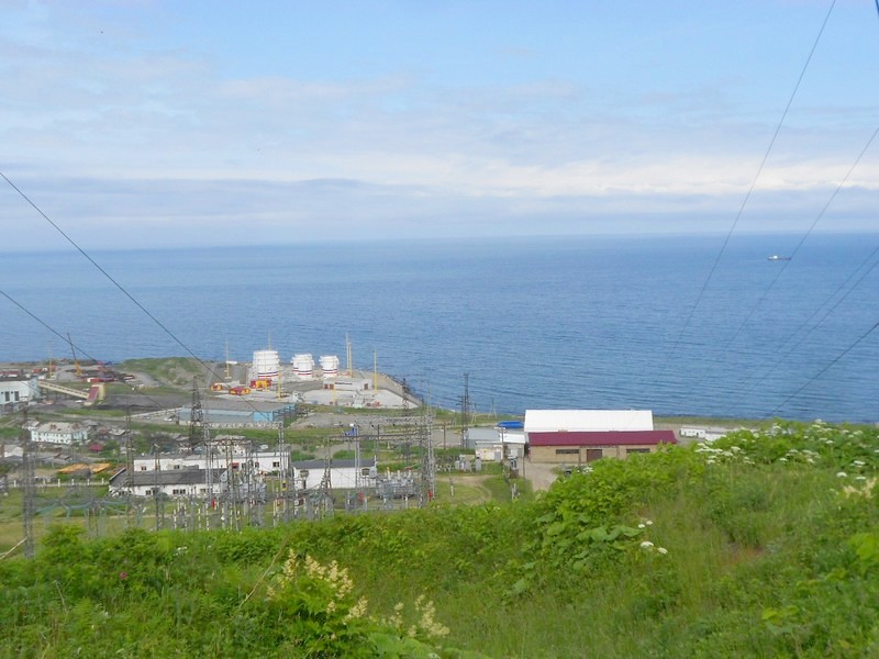 Холмск. Вид с сопки в северной части города. Внизу - электрическая подстанция, железная дорога, топливная база