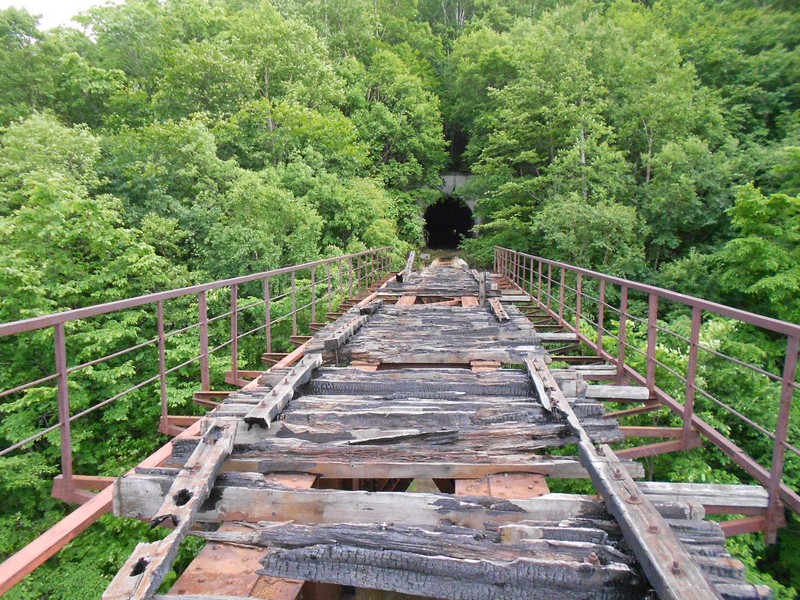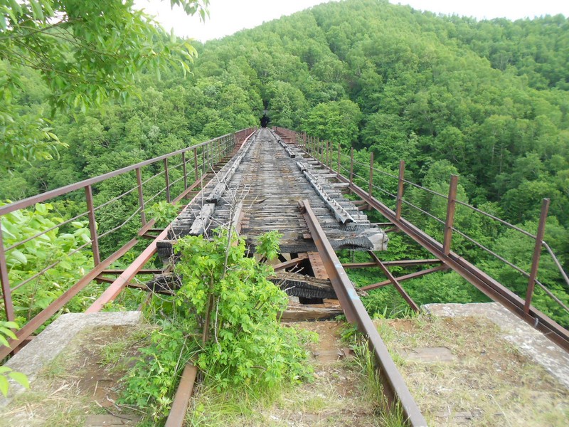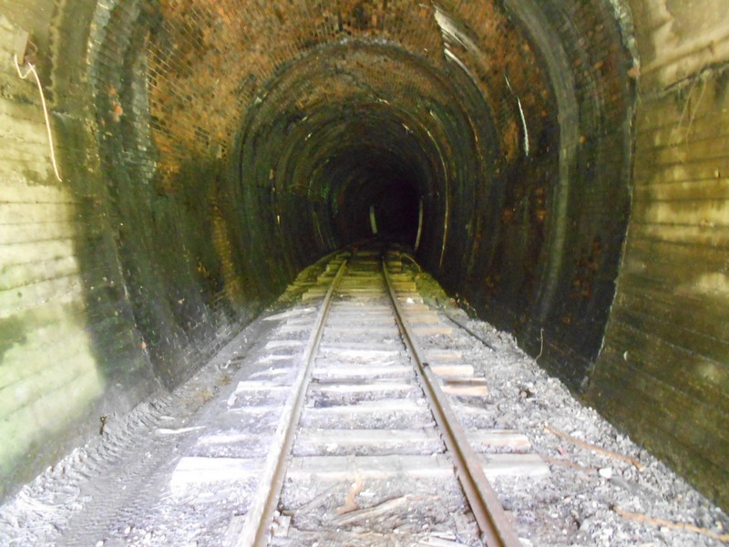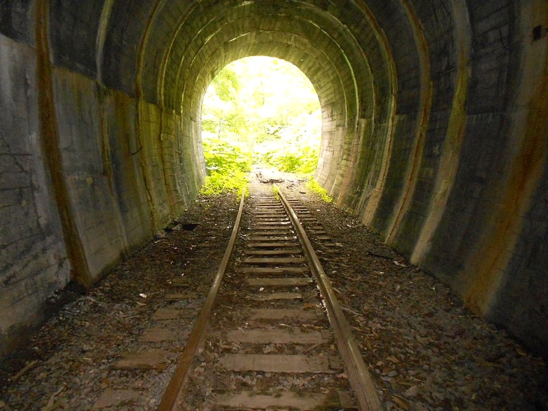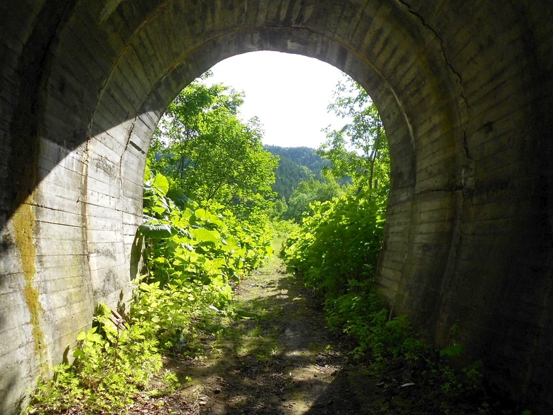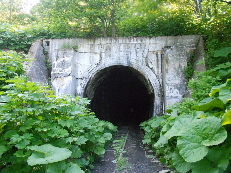 ржавые рельсы, обрывающиеся у первого тоннеля. Затем 60 километров разобранной линии. Время 8:42.
